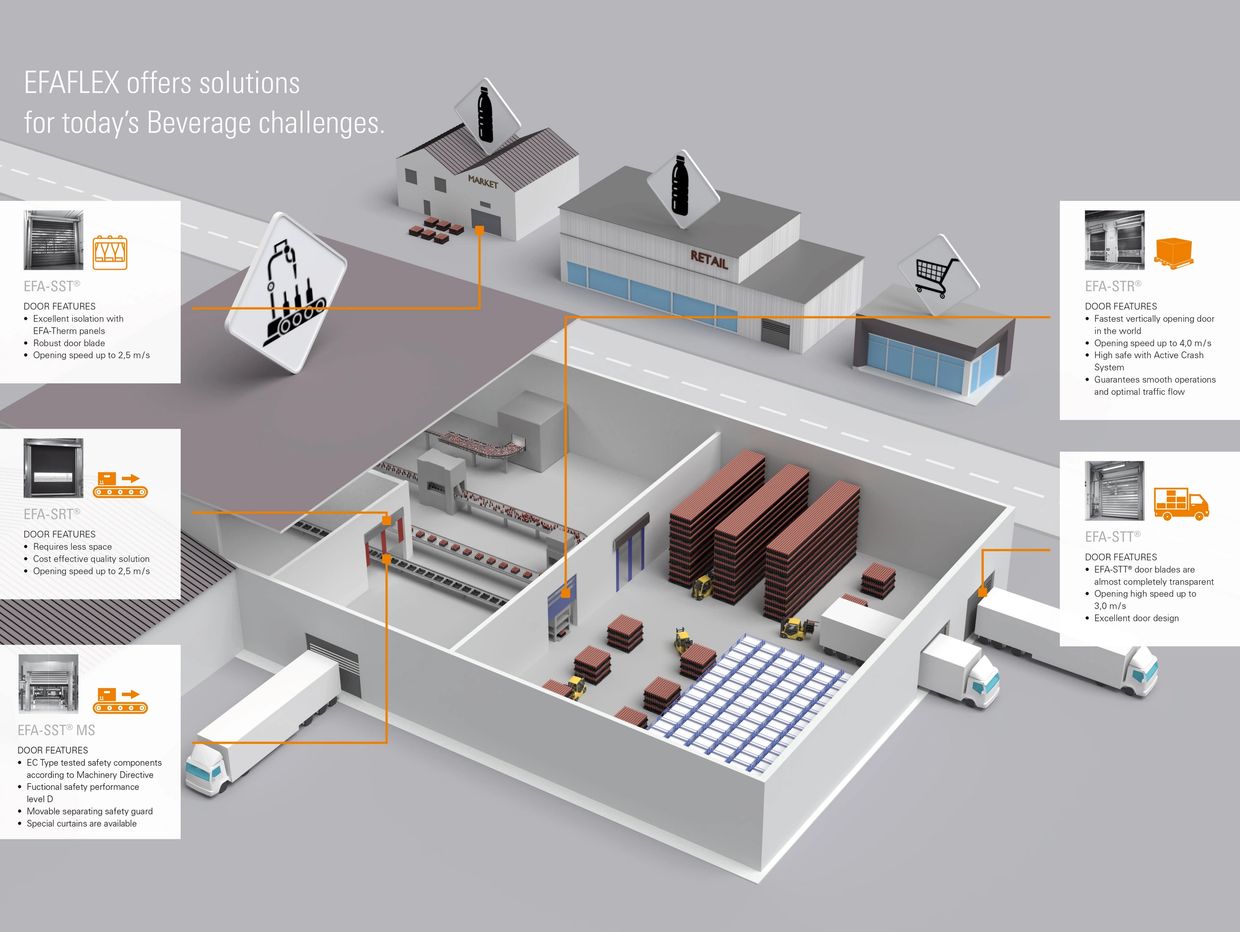 Las puertas rápidas de EFAFLEX son particularmente impresionantes en la industria de bebidas debido a su versatilidad. Su movimiento silencioso en combinación con sus altas velocidades mejoran los procesos de trabajo, los equipamientos especiales como el sistema de choque activo EFA-ACS® incrementan la seguridad de uso, y sus tiempos de apertura cortos garantizan temperaturas estables en cuartos de producción y cuartos de almacenamiento. Las puertas especiales para protección de maquinas también protegen sistemas y personal, y pueden ser integradas perfectamente gracias a su diseño compacto pensado en el ahorro de espacio.